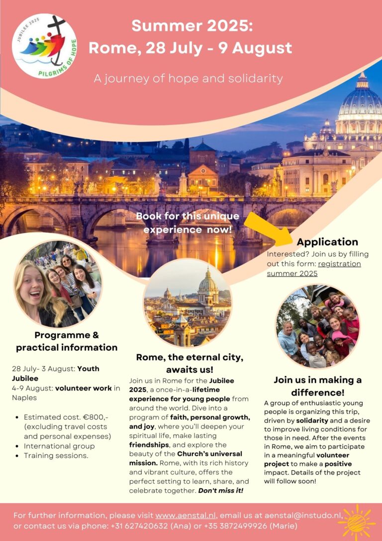 – Zomertrip 2025: van 28 juli tot en met 9 augustus gaan we op reis naar Italië! Deze reis staat in het teken van het vieren van het jubeljaar, cultuur verdieping en vrijwilligerswerk. Meer info: lees de folder. Aanmelding: inschrijfformulier.